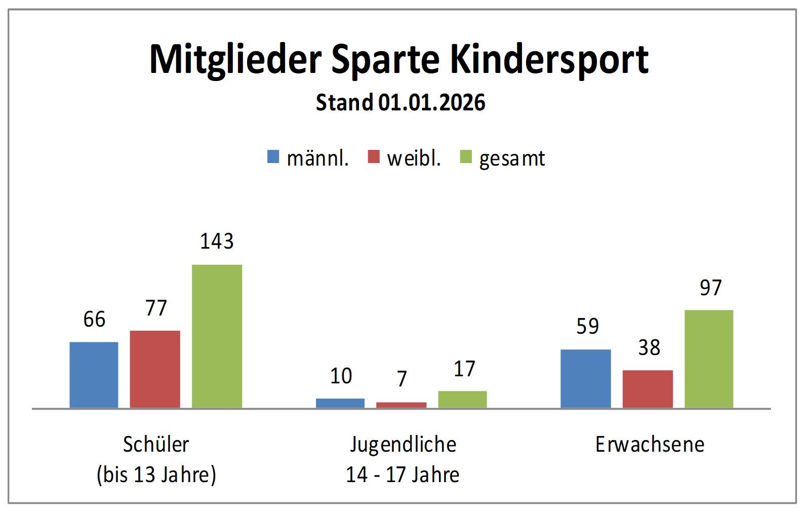 Spartenstatistik 01.01.2026 Aktuell hat die Sparte Kindersport 257 Mitglieder. Die Altersstruktur stellt sich wie folgt dar: